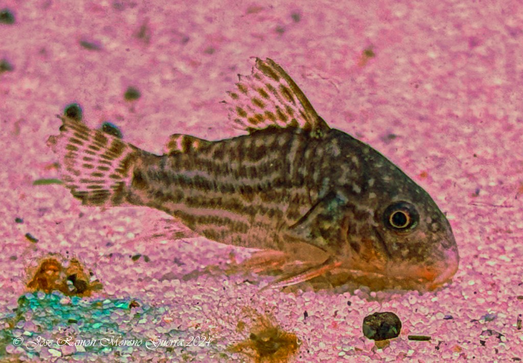 Finalmente logré ver a un par, pero su aspecto me resultó muy sospechoso, casi como en el juego Among Us, cuando detectas al impostor. El patrón de las Corydoras no era el que debería: rayas extrañas en la cabeza, líneas poco convincentes y, sobre todo, una ausencia total de color en las aletas, que normalmente lucen un tono amarillo o naranja.